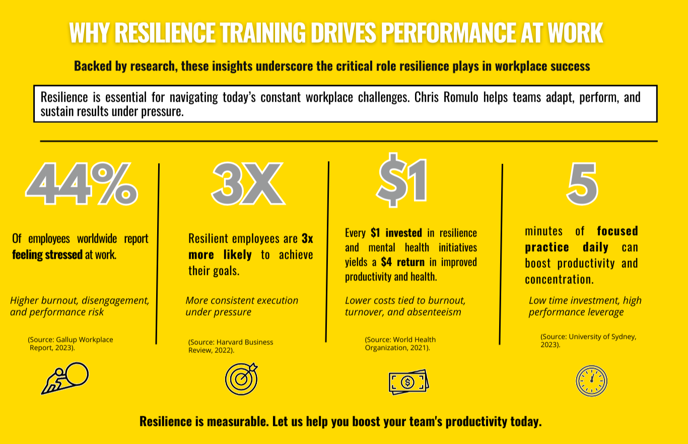 Today’s teams are operating under constant pressure, relentless change, and rising expectations — without ever being taught how to respond to it. When resilience isn’t developed as a skill, performance starts to slip long before burnout shows up. The result isn’t just stress. It’s real business risk.