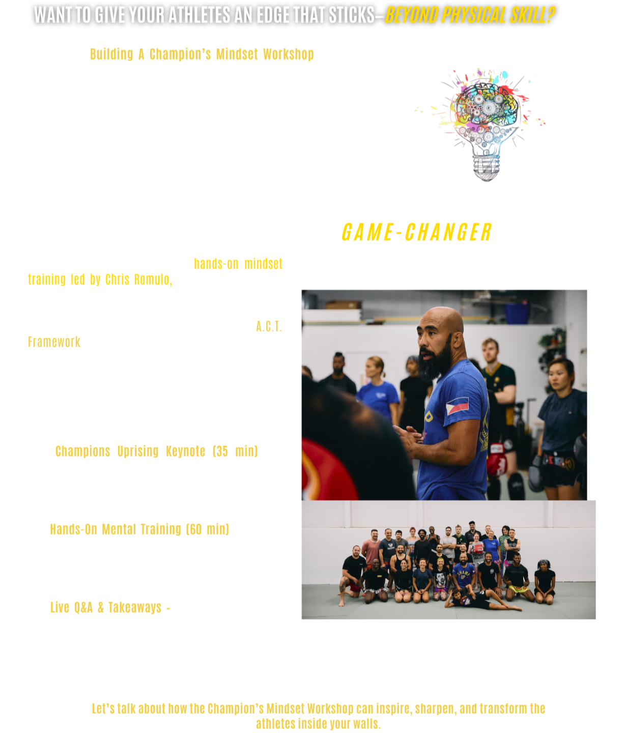 Let’s talk about how the Champion’s Mindset Workshop can inspire, sharpen, and transform the athletes inside your walls.