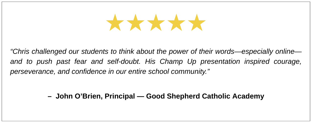 Let’s explore how Chris can bring the Champ Up mindset to your students, athletes, or leadership programs.
