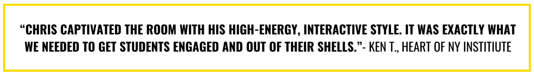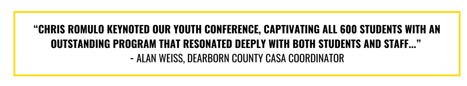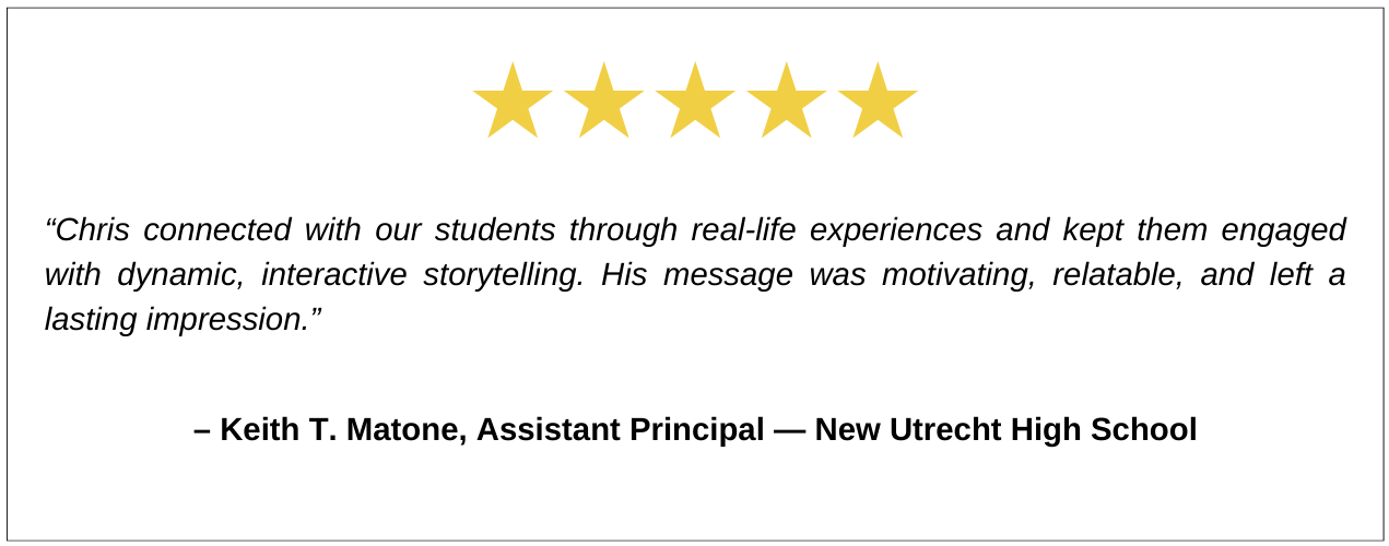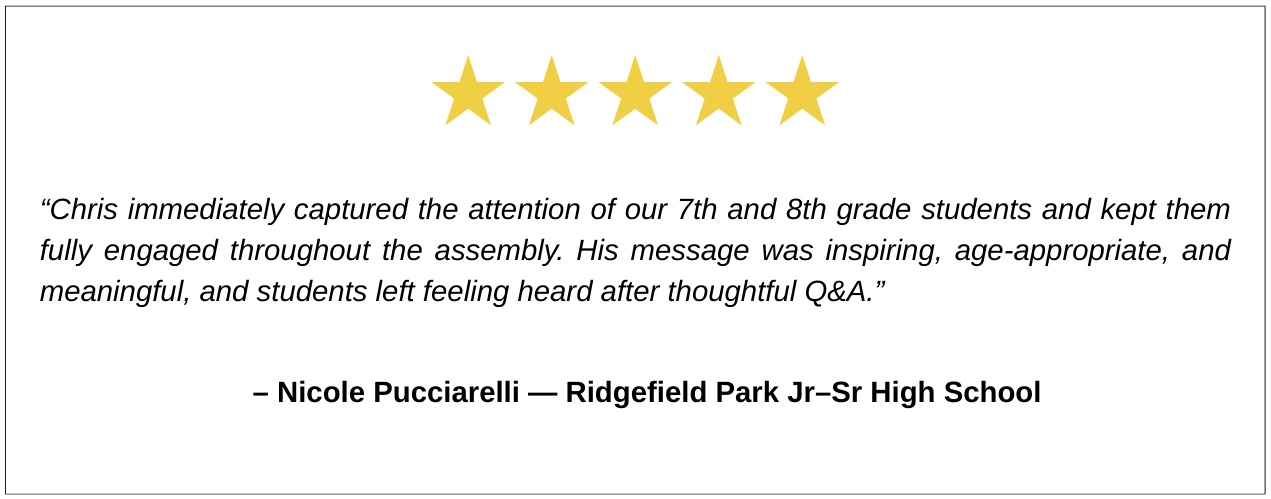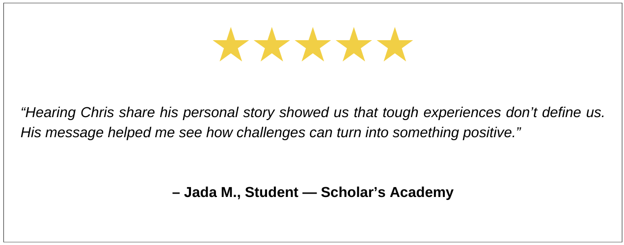 “Chris held students’ attention from start to finish, earning their trust through honesty, humility, and relatable storytelling. Students ages 12–18 felt comfortable stepping up to share openly in front of their peers—something we rarely see—and the connection he created across generations made the message truly land.”