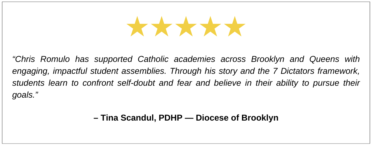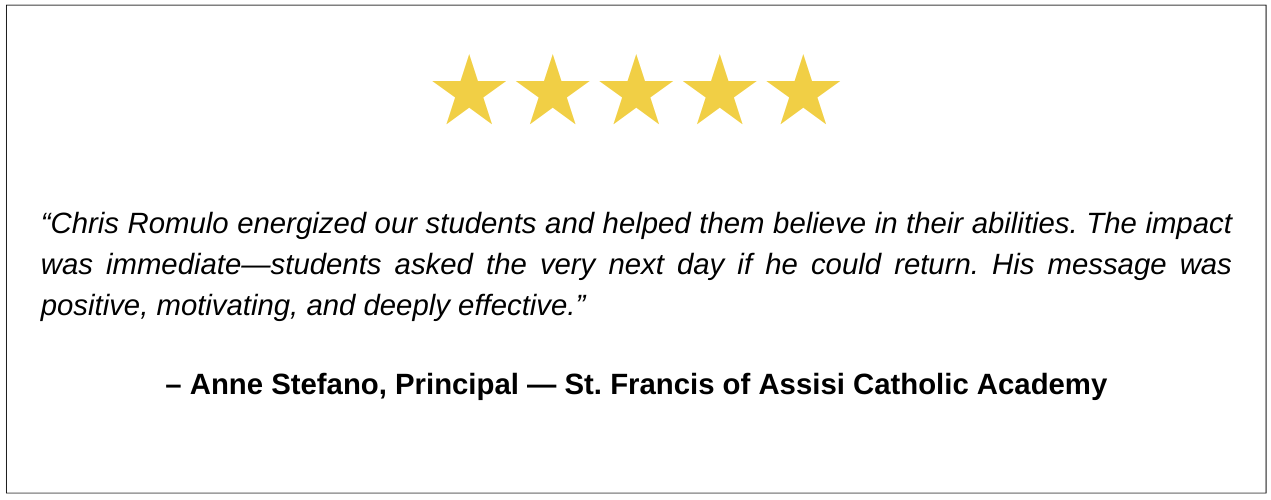 “Chris Romulo was extremely professional and well prepared. His close attention to detail and wanting to tailor his presentation to our school needs was greatly appreciated. It was a pleasure working with him!”